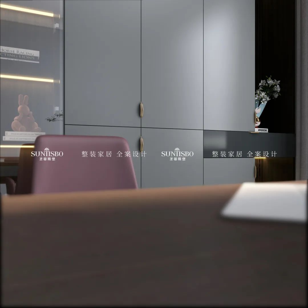 哑灰的定制书柜,冷静理性,带来思绪上井然有序的细密逻辑。天然原生的光感,让视觉达到完美平衡。书房特意配上多裂绿植,让现代简约与传统文化结合,萌发出别出心裁的设计,展现业主对传统文化情结的喜爱。
